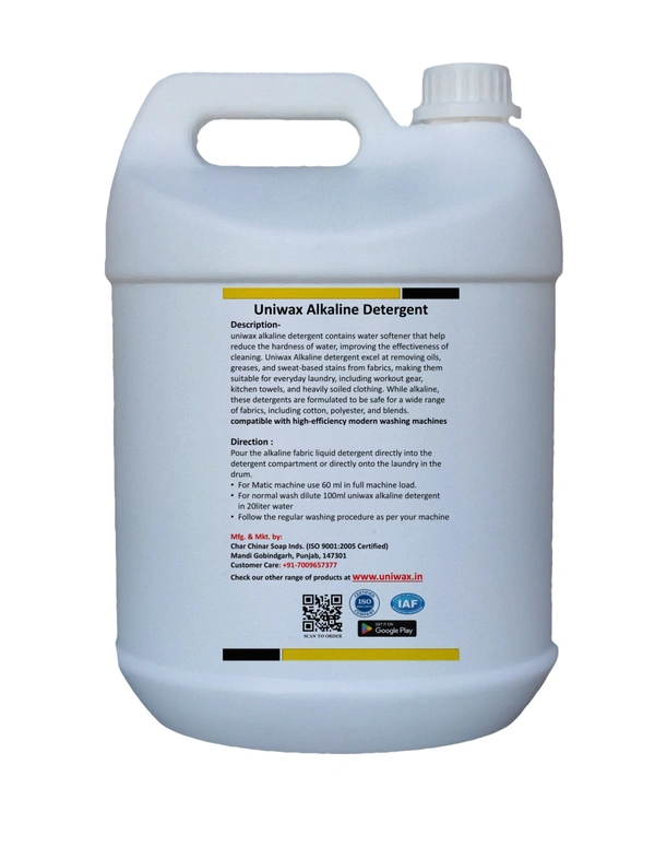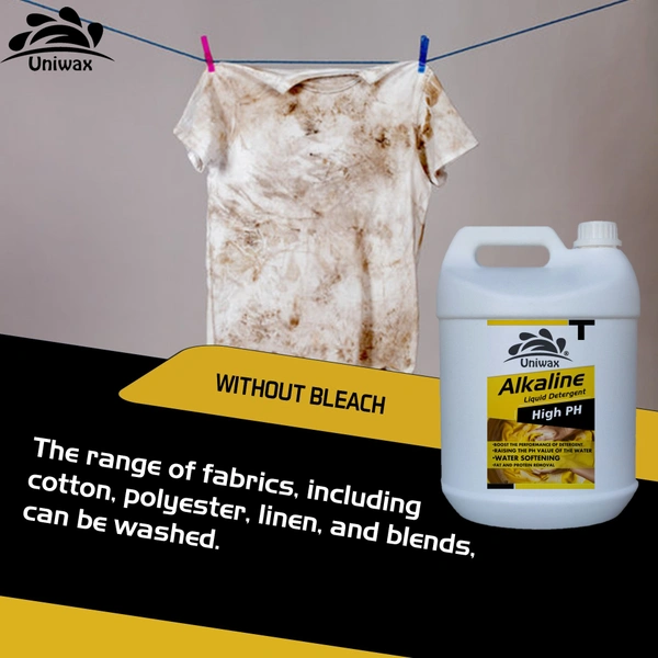 uniwax alkaline detergent contains water softener that help reduce the hardness of water, improving the effectiveness of cleaning. Uniwax Alkaline detergent excel at removing oils, greases, and sweat-based stains from fabrics, making them suitable for everyday laundry, including workout gear, kitchen towels, and heavily soiled clothing. While alkaline, these detergents are formulated to be safe for a wide range of fabrics, including cotton, polyester, and blends. compatible with high-efficiency modern washing machines