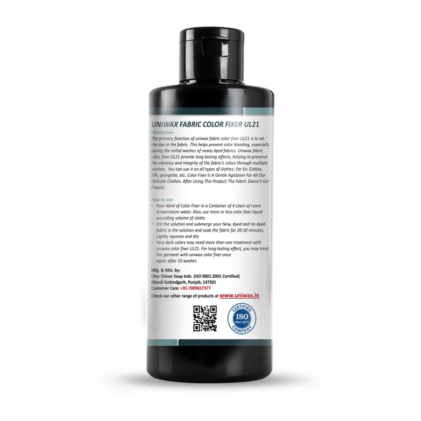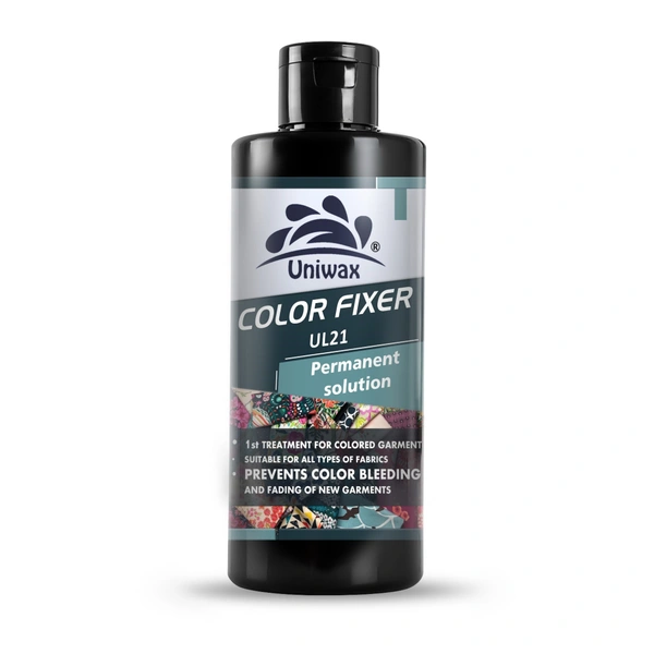 Uniwax Fabric Color Fixer (UL21) is specially formulated to lock in fabric dyes, ensuring vibrant, long-lasting colors on all types of fabrics including silk, cotton, georgette, and more. It helps prevent color bleeding, fading, and staining during washing, keeping your clothes fresh and beautiful for longer. Ideal for both natural and synthetic fibers, this color binder enhances fabric durability without altering the texture or softness.