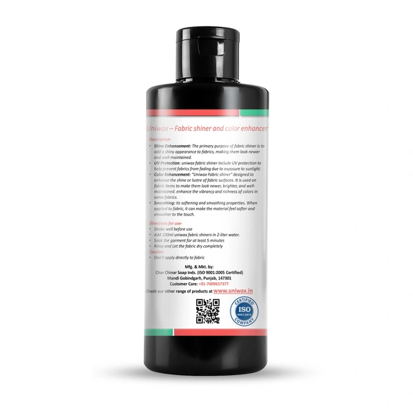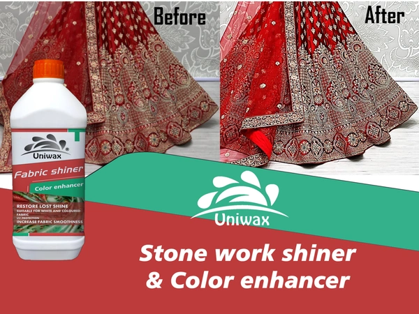 Color Enhancement: “Uniwax Fabric shiner" designed to enhance the shine or lustre of fabric surfaces. It is used on fabric items to make them look newer, brighter, and well-maintained. enhance the vibrancy and richness of colors in some fabrics.