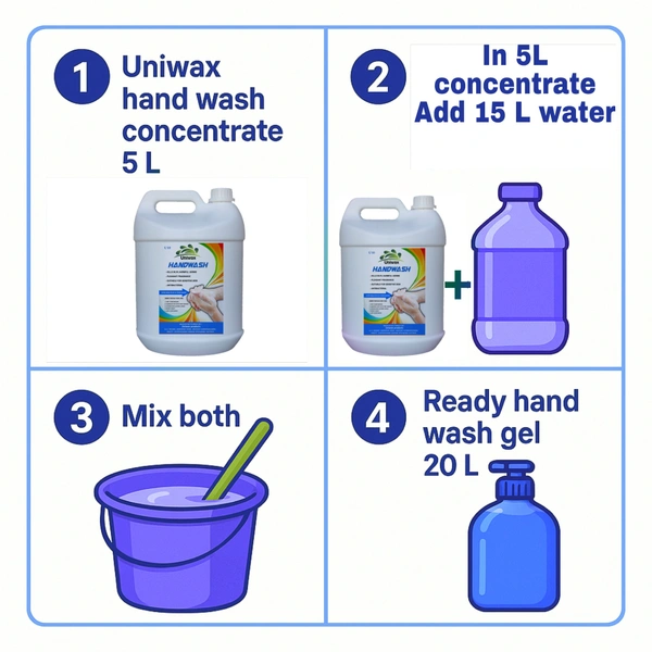 - For 1 liter of concentrate, add 3 liters of water to make 4 liters of handwash solution.