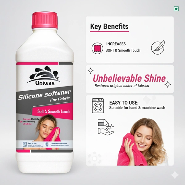 Uniwax Silicone Fabric Softener is a premium-grade softening agent specially formulated to provide fabrics with an exceptionally smooth and luxurious hand feel. Its advanced silicone-based formula enhances fabric flexibility, drape, and elasticity while delivering a brilliant shine and long-lasting softness. Ideal for all types of fabrics — cotton, synthetics, blends, and delicate textiles — it helps reduce wrinkles, improve sewing performance, and restore life to washed garments.