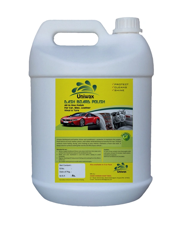 uniwax Car dashboard, Vinyl and leather Polish by uniwax. The leather and vinyl polish from uniwax can be applied on all plastic surfaces, vinyl and dashboards to maintain the glossiness. It also gives long-lasting shine to the dashboard, vinyl and leather by keeping the dust away and protecting against atmospheric oxidation and UV rays. a It gives beautiful aroma while sitting in the car