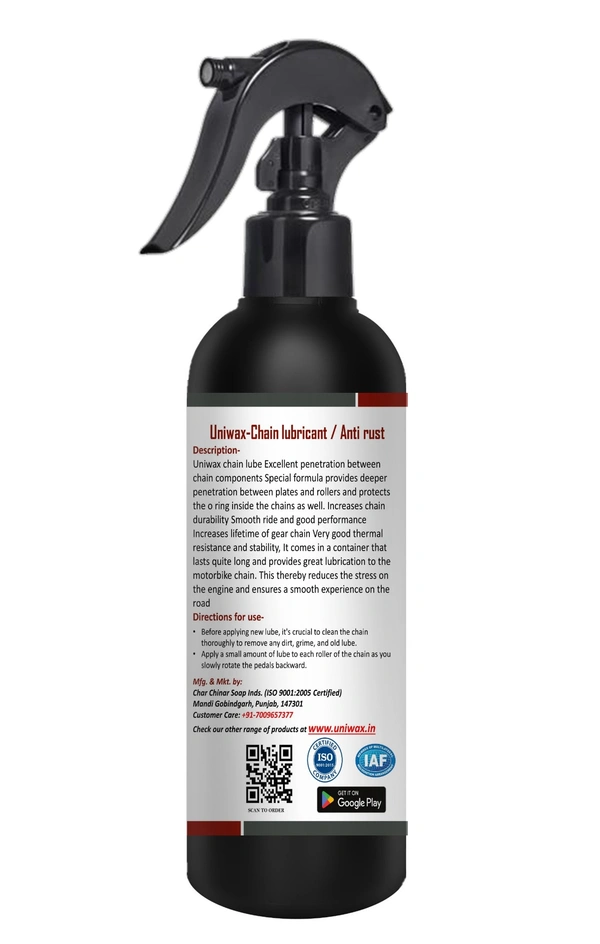 Introducing the UNIWAX Chain Lubricant / Anti-Rust Spray & Chain Cleaner Spray, your ultimate solution to prevent chain breakage and ensure the longevity of your gear chain. Perfectly formulated to meet the needs of your high-performance requirements, this product from Uniwax Products promises to enhance your ride's efficiency and durability.
