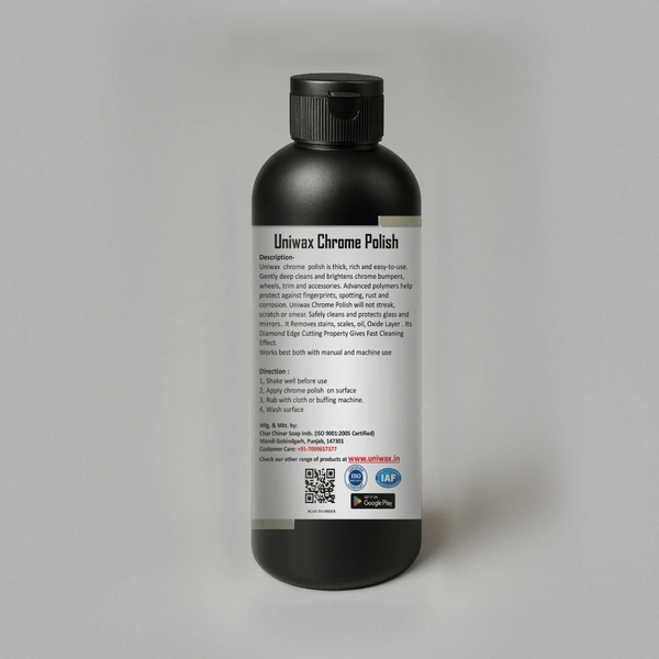 Introducing the UNIWAX Chrome Polish – your go-to solution for achieving a dazzling, mirror-like shine on all your chrome and metal surfaces. Whether you're looking to enhance the look of your automobile, motorcycle, or household accessories, our premium chrome polish is engineered to deliver unmatched results.