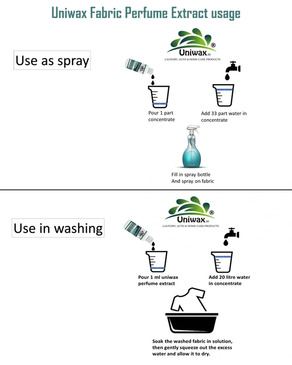 1.After washing clothes Add 1ml Uniwax fabric perfume Extract directly into your rinse water ( 1 ml in 20 liter water)