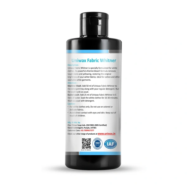 Experience the magic of freshness with Ultra White Fabric Whitener from Uniwax Products. Tired of seeing your favorite garments lose their charm? Our fabric whitener not only brightens your fabrics but also expertly removes any unsightly yellowing, ensuring your clothes look as good as new. Its powerful formula is designed to remove stains, kill bacteria, and add that extra sparkle to your wardrobe, all while being safe for use on all types of fabrics.