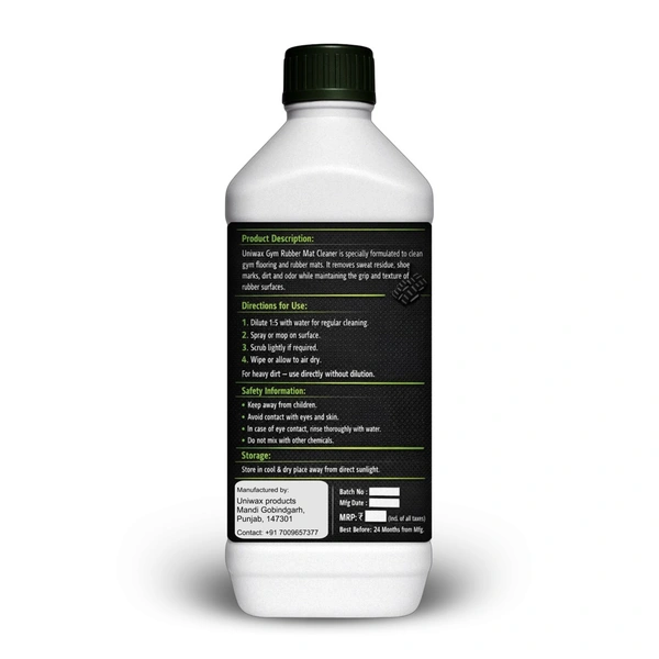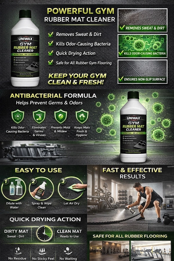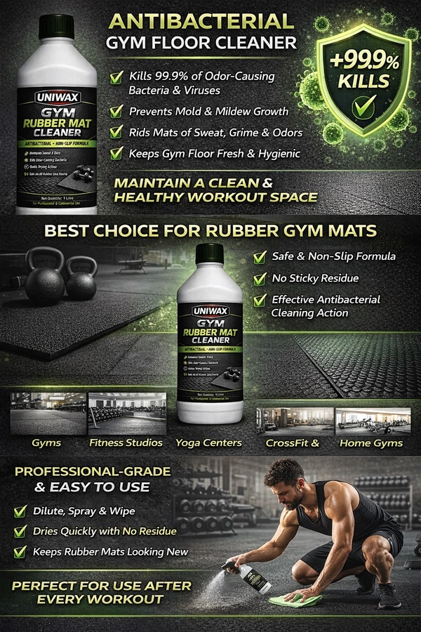 Keep your workout environment clean, hygienic, and odor-free with Uniwax Gym Rubber Mat Cleaner — specially formulated for professional gyms, fitness studios, and home workout spaces. This advanced antibacterial cleaner effectively removes sweat residue, dirt, shoe marks, and odor-causing bacteria while maintaining the grip and durability of rubber flooring.