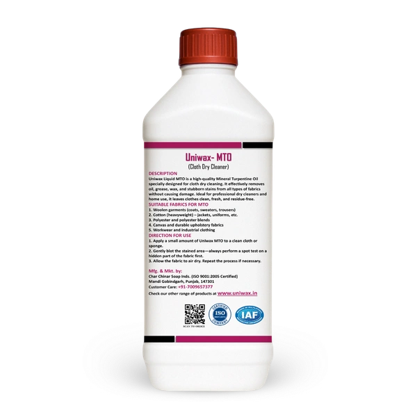 Uniwax Liquid MTO is a premium-grade Mineral Turpentine Oil formulated specifically for cloth dry cleaning. It effectively dissolves and removes oil, grease, wax, and other stubborn stains without harming fabric integrity. Ideal for professional dry cleaners as well as domestic use, it leaves garments clean, fresh, and free from residue.