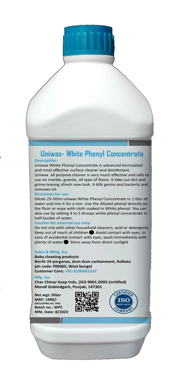 - Dilution Instructions: Simply dilute 25-50ml of Uniwax White Phenyl Concentrate in 1 liter of water and mix for a minute.
