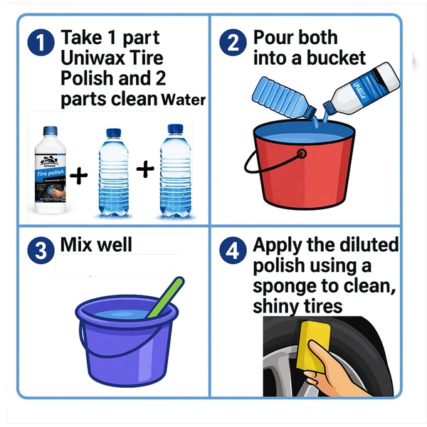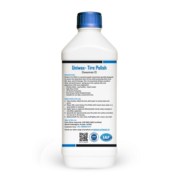 Uniwax Tire Polish Concentrate (1:2) is a high-performance, water-based formula designed to restore the deep black shine of tires while offering long-lasting protection against dust, fading, and cracking. This concentrated solution can be diluted 1 part polish to 2 parts water, making it cost-effective and highly efficient for both personal and professional detailing.