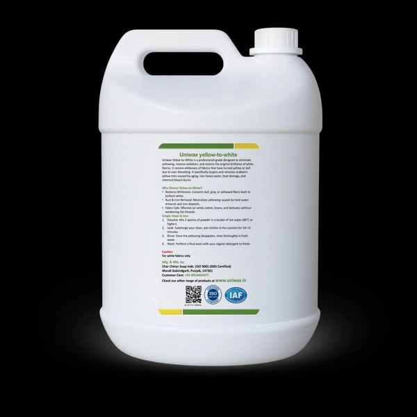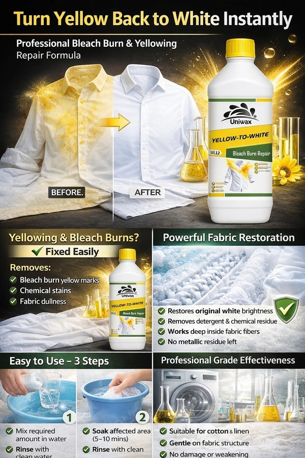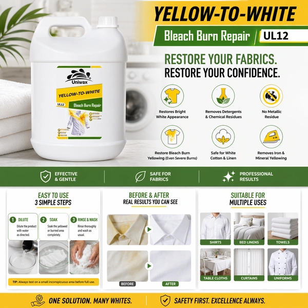Uniwax Yellow-to-White is a professional-grade designed to eliminate yellowing, reverse oxidation, and restore the original brilliance of white fabrics. it restore whiteness of fabrics that have turned yellow or dull due to over-bleaching. It specifically targets and removes stubborn yellow tints caused by aging, iron-heavy water, heat damage, and chemical bleach burns